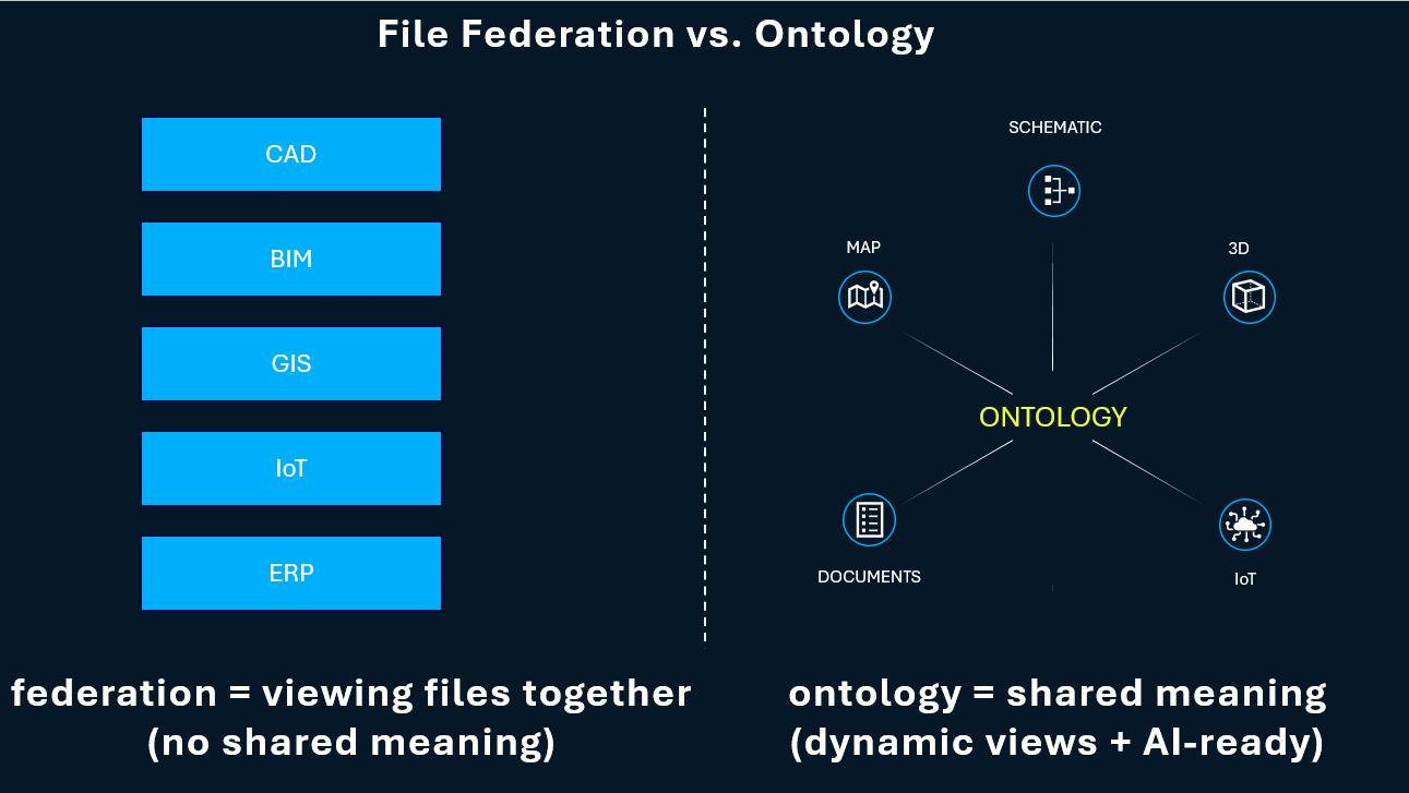 Digital twins are everywhere in the conversation today — from airports to rail networks, utilities to manufacturing. But not all twins are created equal. The biggest dividing line? Whether they’re built on file federation or on a true ontology.
