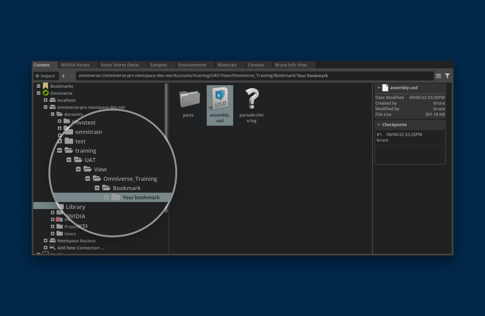 Use the folder tree to navigate to your bookmark, and open the file named assembly.usd inside it.