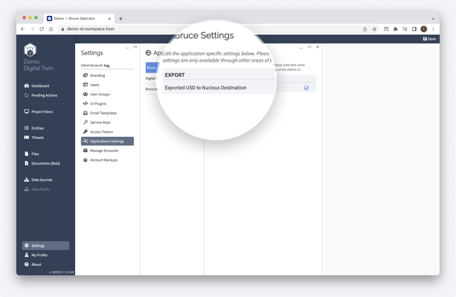 First, you’ll need to enable exporting to USD, and to the Nextspace Nucleus server. Go to the Settings page by clicking the menu item at the bottom left of the screen.