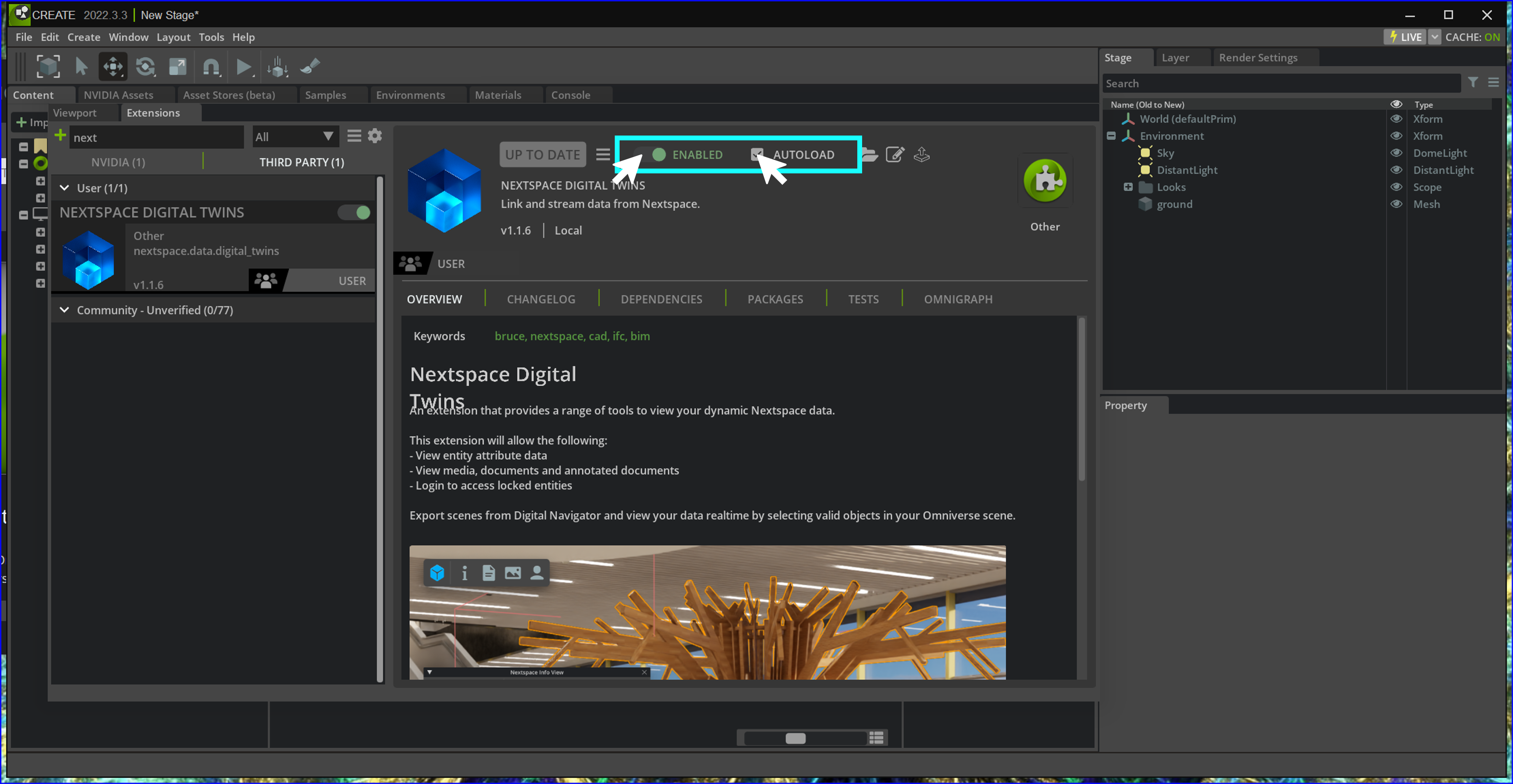 6d: Click “Disabled” to enable the extension and click the checkbox for “Autoload” so that the extension loads automatically when Omniverse Create starts.